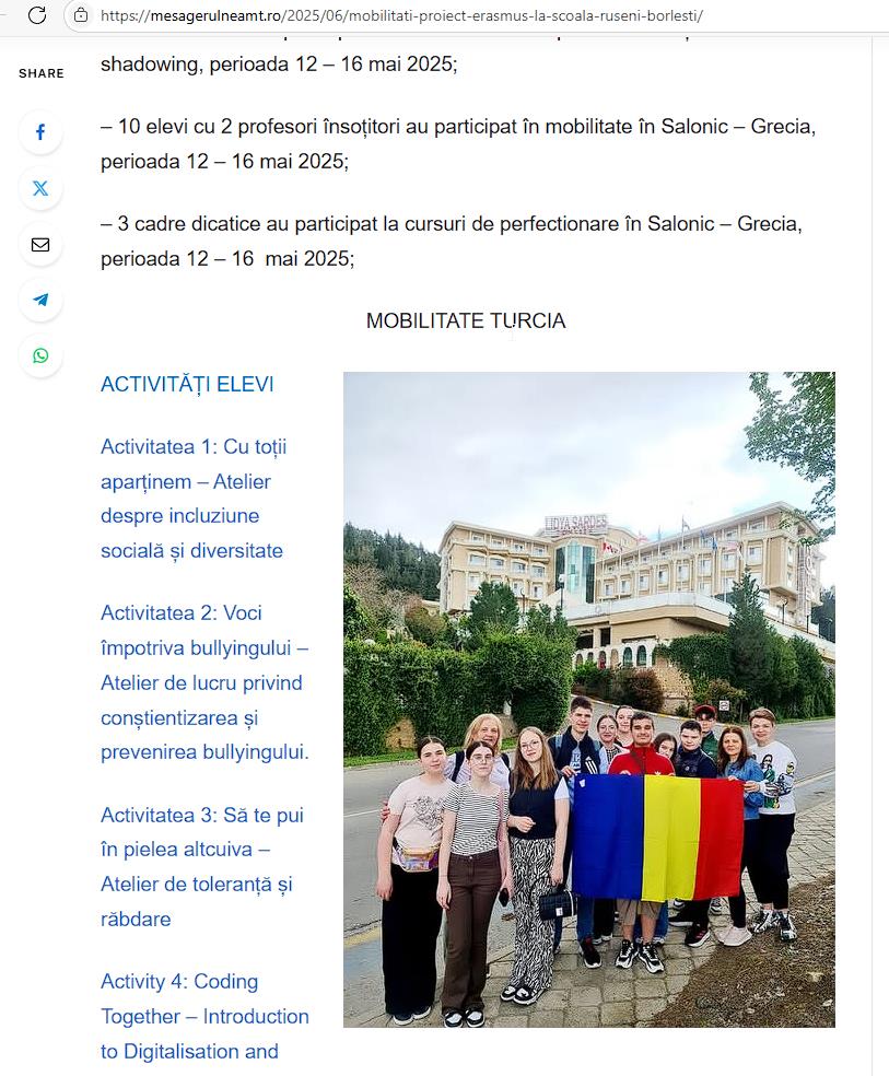Concurs de selecție beneficiari mobilități de învățare Acțiunea Cheie 1 – Educația Școlară (SCH) din cadrul proiectului de Acreditare Erasmus+ Apelul 2024-2025 2024-1-RO01-KA121-SCH-000211177 / OBIECTIVE INSTITUȚIONALE PROPUSE SPRE ÎNDEPLINIRE PRIN INTERNAȚIONALIZAREA ACTIVITĂȚILOR ȘCOLARE - articol Mesagerul de Neamt